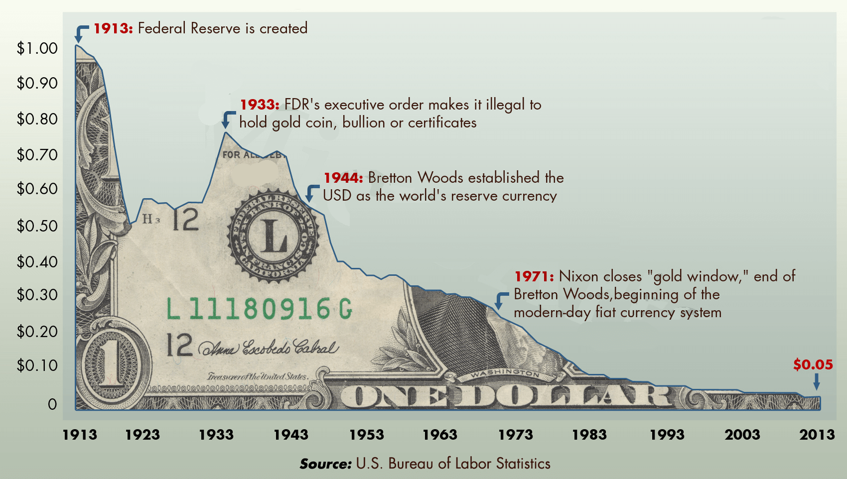 This stealing has been going on since 1913. If the value of your money was 100% in 1913, it dropped to 5% in 2013. 95% of its value was stolen from those holding this "money" since 1913.